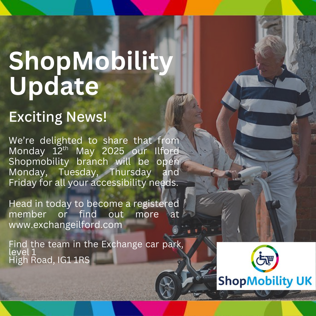 We’re delighted to share that from Monday 12th May 2025 our Ilford Shopmobility branch will be open Monday, Tuesday, Thursday and Friday for all your ...